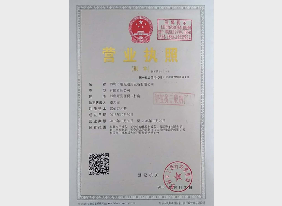 邯鄲市瑞冠智能化裝備有限公司辦公室地址位于具有1萬年的歷史和3100年的建城史的邯鄲,邯鄲 邯鄲開發(fā)區(qū)賈口村南,于2015-10-30 在邯鄲工商局注冊(cè)成立,注冊(cè)資本為200萬人民幣(萬元),公司已經(jīng)公司發(fā)展壯大的5年,愿與社會(huì)各界同仁攜手合作,謀求共同發(fā)展,繼續(xù)為新老客戶提供優(yōu)秀的產(chǎn)品和服務(wù)。我公司主要經(jīng)營包裝專用設(shè)備、工業(yè)自動(dòng)化控制設(shè)備、搬運(yùn)設(shè)備制造與銷售;塑料制品、五金產(chǎn)品的銷售(依法須經(jīng)批準(zhǔn)的項(xiàng)目,經(jīng)相關(guān)部門批準(zhǔn)后方可開展經(jīng)營活動(dòng)),我公司與多家邯鄲零售商和代理商建立了長期穩(wěn)定的合作關(guān)系,品種齊全、價(jià)格合理,企業(yè)實(shí)力雄厚,重信用、守合同、保證產(chǎn)品質(zhì)量,以多品種經(jīng)營特色和薄利多銷的原則,…